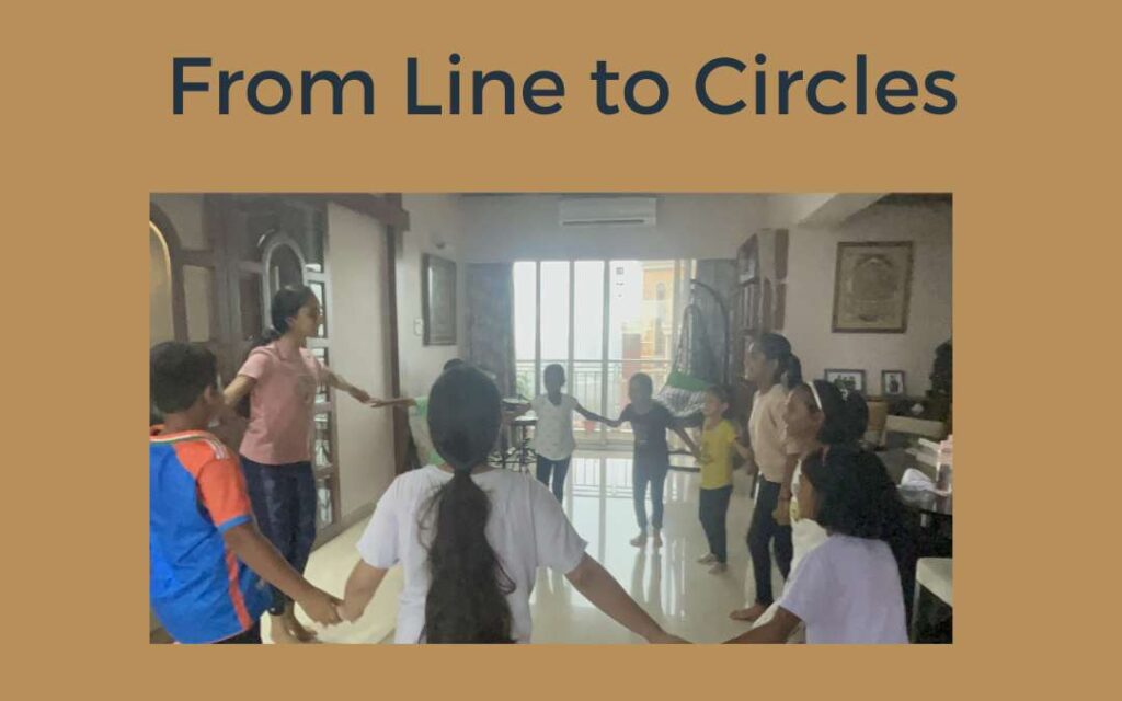 And so we went from topic to topic – not in a rigid manner but fluidly whatever logically and intuitively followed. None of this replaced formal mathematics, but something shifted for these kids – the way it had for me many years back – completing, shall we say, a full ‘circle’. Maths became their friend as they experienced in their bodies. What struck me most during those sessions wasn’t how quickly the children learned concepts, but how relaxed they became around them. Mathematics stopped being something that happened to them and became something they participated in.